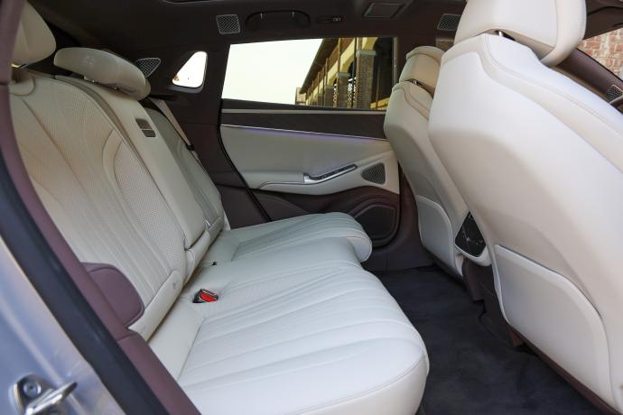 La parte trasera también es majestuosa, con asientos con idénticas funciones realzados con reposapiernas. Y además, con una longitud de 5,18 metros, a los ocupantes no les faltará espacio. También podrán entretenerse con las pantallas: en la parte delantera, un panel central de 17,3 pulgadas se complementa con dos displays de 13,2 pulgadas. Por otro lado, un head-up display de realidad aumentada de 50 pulgadas ayudará al conductor.